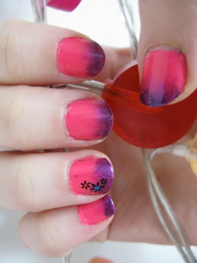 Halusin kokeilla pitkästä aikaa liukuvärjäystä. Vaatii kyllä vähän vielä harjottelua, kerran olen tainnut aiemmin tehdä liukuvärjätyt kynnet. Käytin vain kolmea eri väristä lakkaa, ensi kerralla pitää varmaan käyttää enemmän eri sävyjä niin tulisi ehkä mielenkiintoisemmat.:) Lisäsin vielä nimettömiin kynsitarrat. Täytyy vielä erikseen mainita, että kerrankin kuviin välittyi juuri oikea sävy.