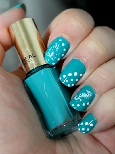 Halusin päästä kokeilemaan tota mun uutta Konad-laattaa, siinä on niin suloisia merieläimiä! Dotting toolilla lisäsin vähän pisteitä piristämään. Aika nopeat koristelut koska oon tästä ihan justiinsa lähdössä töihin ja lakkapohjan lakkasin eilen illalla töiden jälkeen. Nämä iltavuoroviikot on vähän huonoja kynsikoristeluiden suhteen. Jotain piti kuitenkin lakata koska vanhat lakat oli jo aika kuluneet.